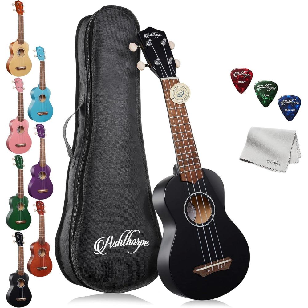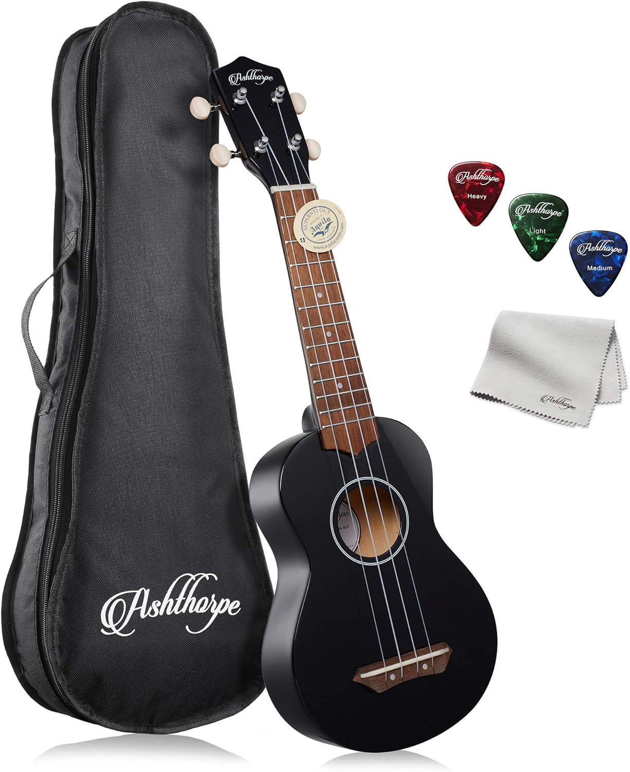 Ukulele for beginners: This Ashthorpe ukulele has been designed for players of all ages and skill levels. The 21-inch soprano ukulele size is perfect for young learners. This ukulele bundle kit includes pre-installed Aquila nylon strings, a “gig bag” guitar case, cleaning cloth, and celluloid picks (thin, medium, and heavy).