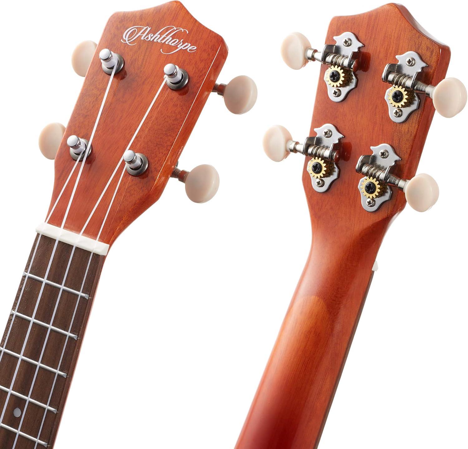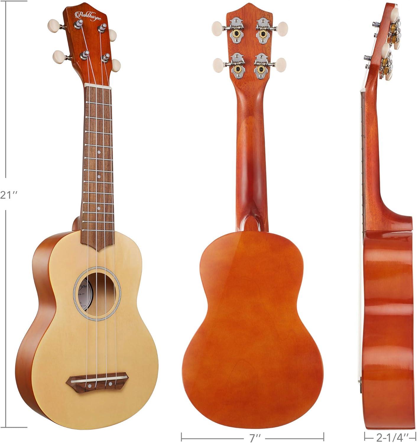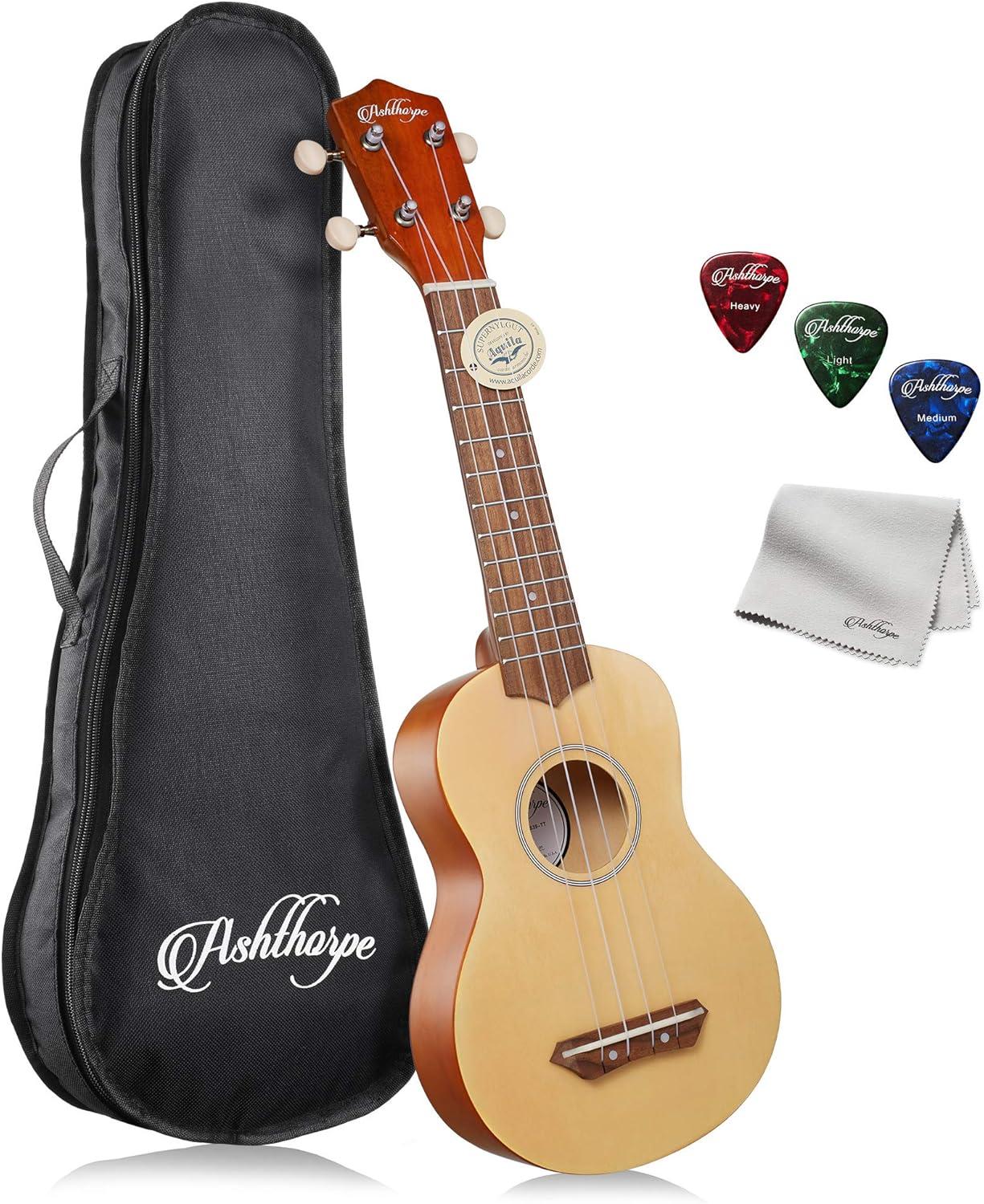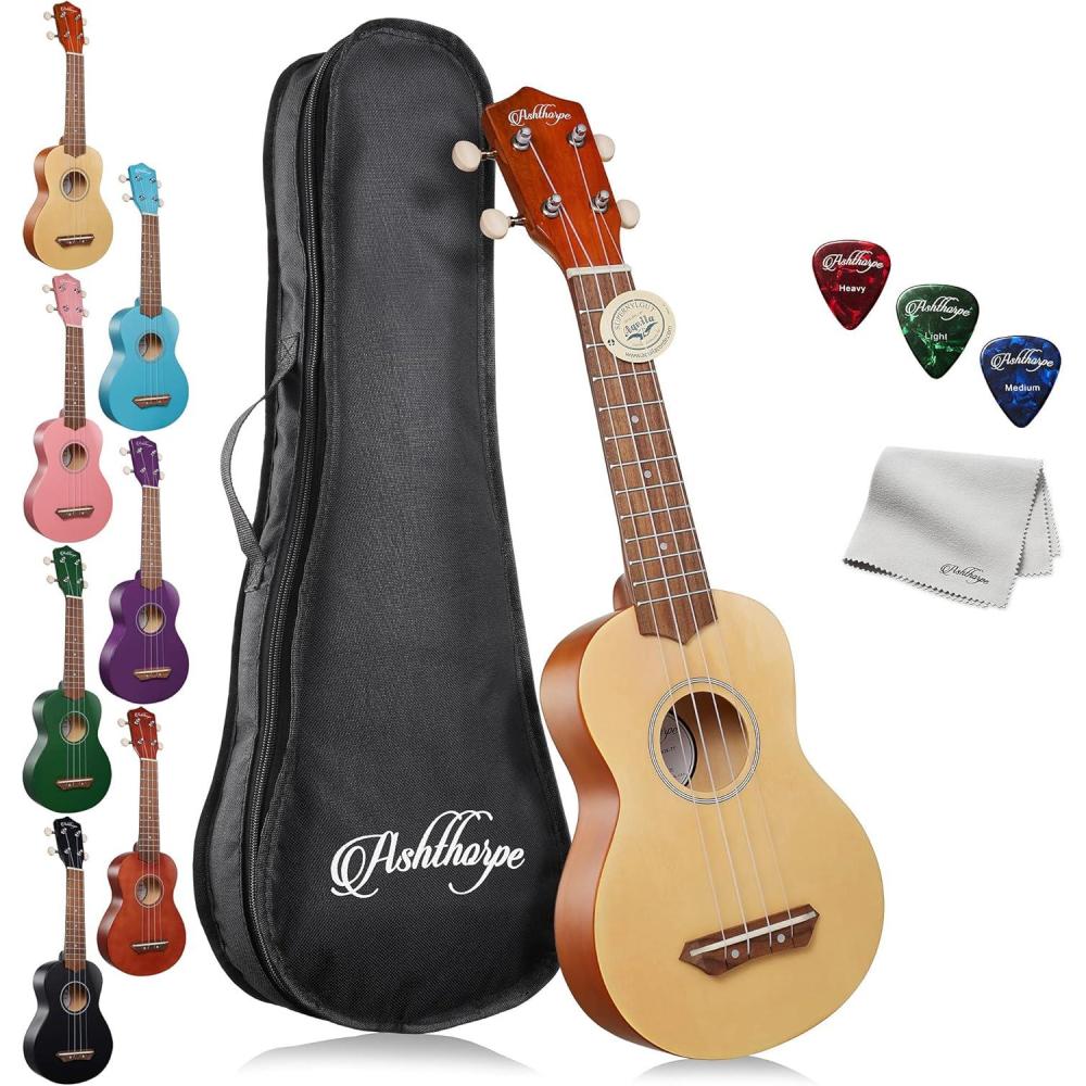 Ukulele for beginners: This Ashthorpe ukulele has been designed for players of all ages and skill levels. The 21-inch soprano ukulele size is perfect for young learners. This ukulele bundle kit includes pre-installed Aquila nylon strings, a “gig bag” guitar case, cleaning cloth, and celluloid picks (thin, medium, and heavy).